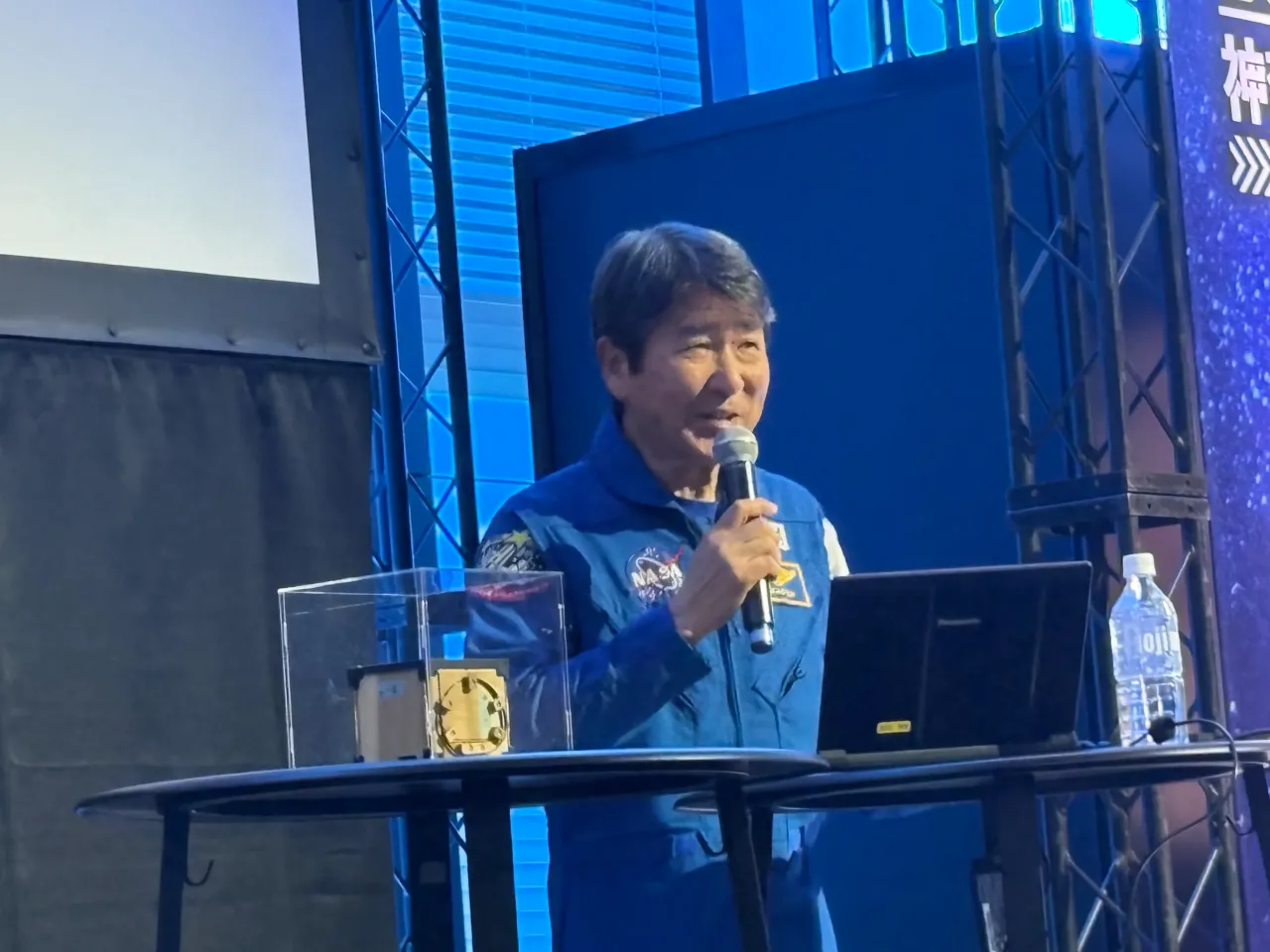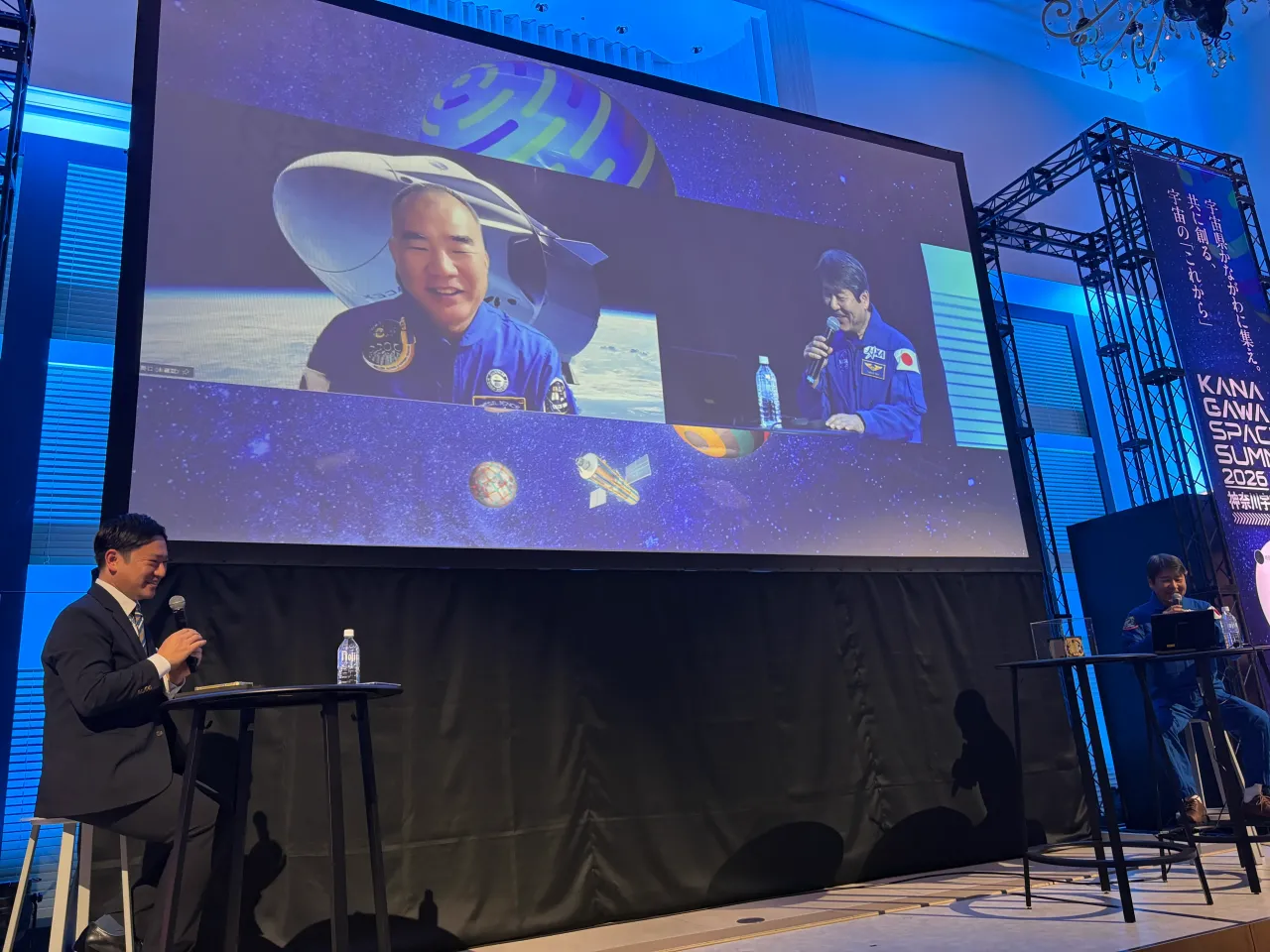 注目のキーノートセッションの冒頭、モデレーターを務める日本テレビの辻岡義堂さんが登壇者を呼び込むと、会場は大きな拍手に包まれた。宇宙飛行士 土井隆雄さんはステージに姿を見せ、野口聡一さんはオンラインで参加。土井さんは冒頭「実家が茅ヶ崎市にあるんです」と神奈川に縁があることを説明し、会場の空気がほどけた。