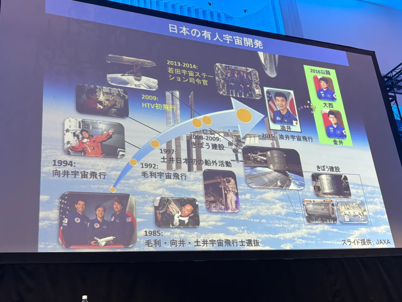 土井さんはまず、日本の有人宇宙開発の歩みを振り返った。1985年に土井さん、毛利衛さん、向井千秋さんが第1世代として選抜され、宇宙での技術獲得を段階的に積み上げてきたこと。1992年の毛利さんのフライトでは材料実験、1994年の向井さんのフライトでは生命科学実験、そして1997年の自身の初フライトでは船外活動技術の獲得を目指したこと。こうした積み重ねが、2008年の国際宇宙ステーション(ISS)「きぼう」日本実験棟の完成につながり、野口さんら第2世代、現在の第3世代へと受け継がれていったという。