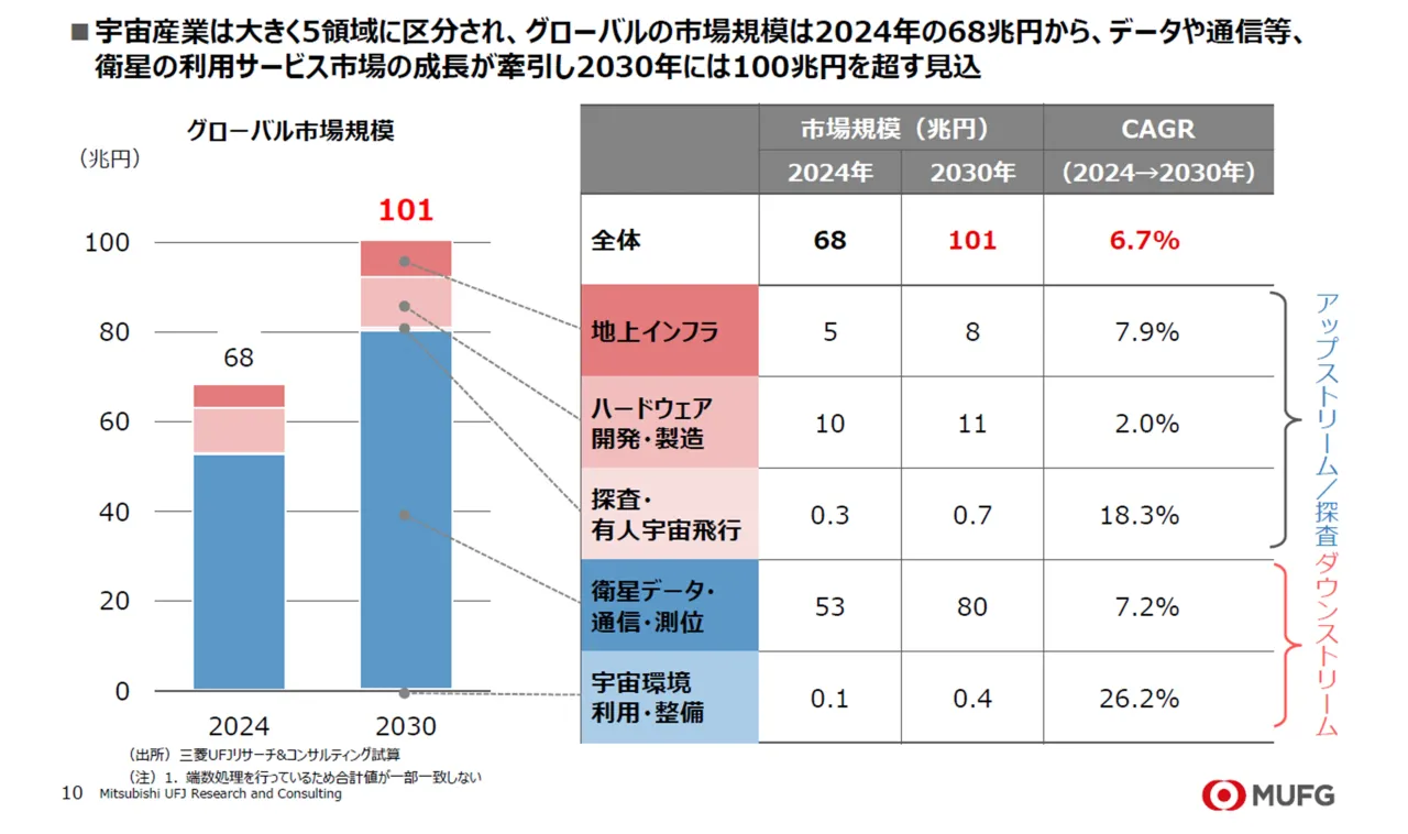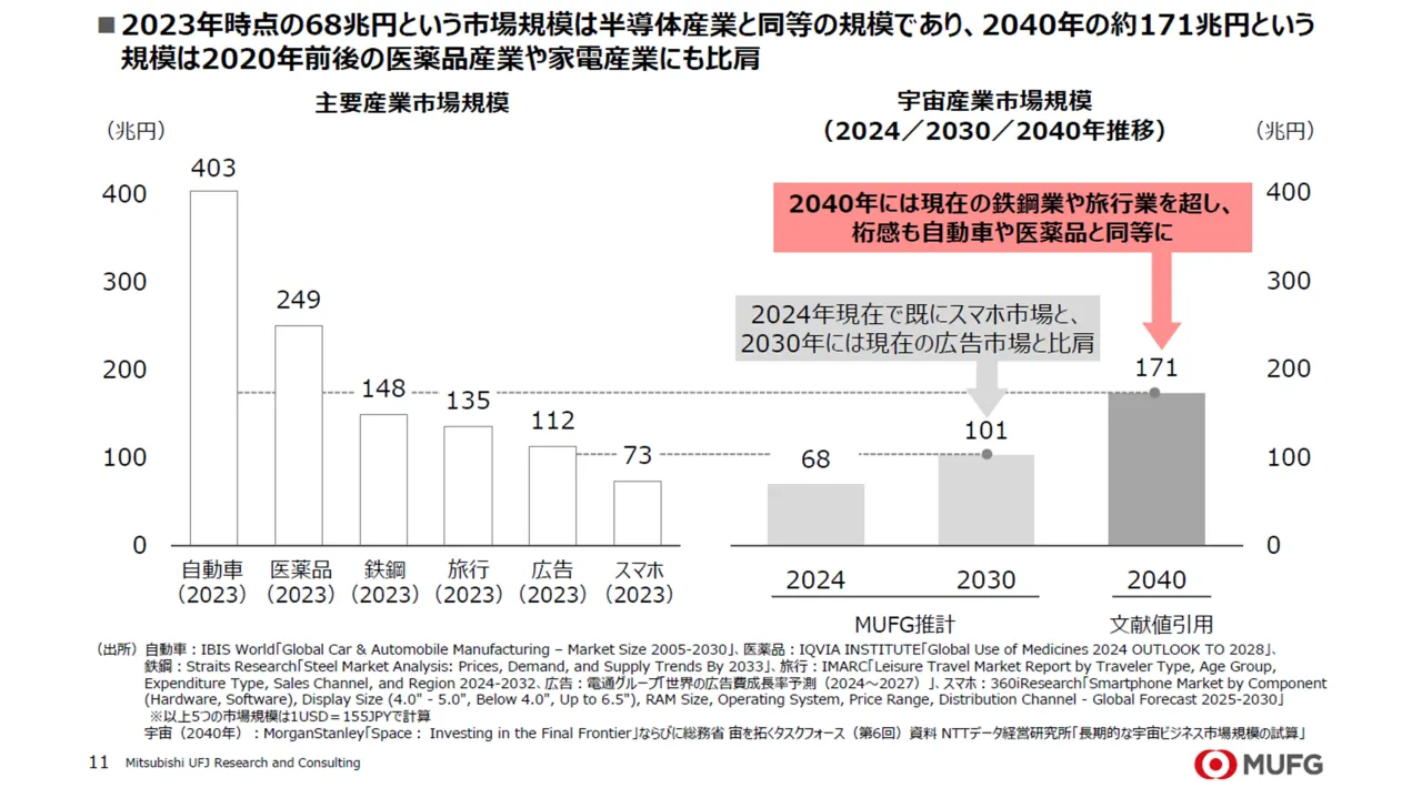 宇宙産業の市場規模は、ここ数年で加速度的に拡大している。三菱UFJリサーチ&コンサルティングの試算によれば、現在およそ68兆円規模にあるこの市場は、2030年には101兆円、2040年には170兆円へと拡大する見込みだ。