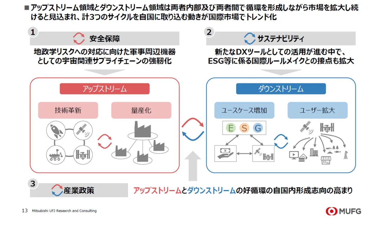 国際的な供給網の不安定化に直面し、各国は自国内で製造・運用を完結させる方向に舵を切っている。宇宙産業も例外ではなく、経済安全保障の観点から各国が投資を強化し、産業政策として宇宙を重視するようになっている。こうした三つの潮流が交差することで、宇宙産業は拡大のスピードをさらに加速させている。