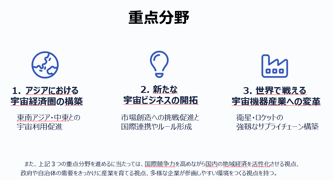 高濱 はい。一つ目は「アジアにおける宇宙経済圏の構築」。日本がリーダーシップを発揮してアジア圏内での宇宙ビジネスやサービスの展開・基盤作りを強化することを目指します。二つ目が「新たな宇宙ビジネスの開拓」。従来の枠組みにとらわれず、データ利用や異産業連携を含めた多様なビジネス創出を重視しています。そして三つ目が「世界で戦える宇宙機器産業への変革」です。日本発の部品・機器・人工衛星などの分野でグローバル競争に勝てるよう、産業基盤やサプライチェーンを強化・変革することが不可欠です。