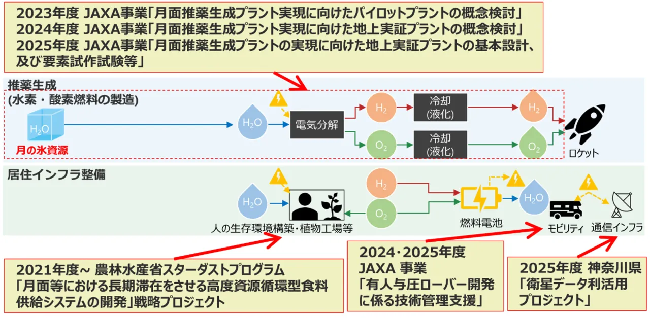 宇宙航空研究開発機構(Japan Aerospace Exploration Agency: JAXA)と月の水資源を利用した月面推薬生成プラント構想の協議も開始し、2021年6月にJAXAと「月面推薬生成プラントの構想検討に係る連携協力協定」を締結し、約1年間をかけて技術要素、研究課題の洗い出しおよび研究開発計画の検討を実施しました。