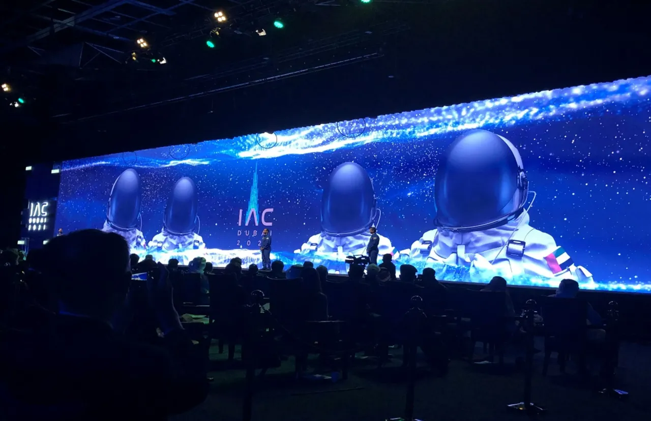 数千人は入るであろうドバイのDubai World Trade Centerのメインホールでオープニングセレモニーが行われ、コロナ禍にあって立ち見がでるほどの盛況ぶりでした。真っ暗な会場に超巨大スクリーン(図1)が設置され、UAE国歌斉唱、オープニングスピーチ、昨年度の授賞式、UAE宇宙飛行士の紹介、演武と映像の融合ショーなど、ホスト国としてのUAEの振る舞いも堂々たるものでした。