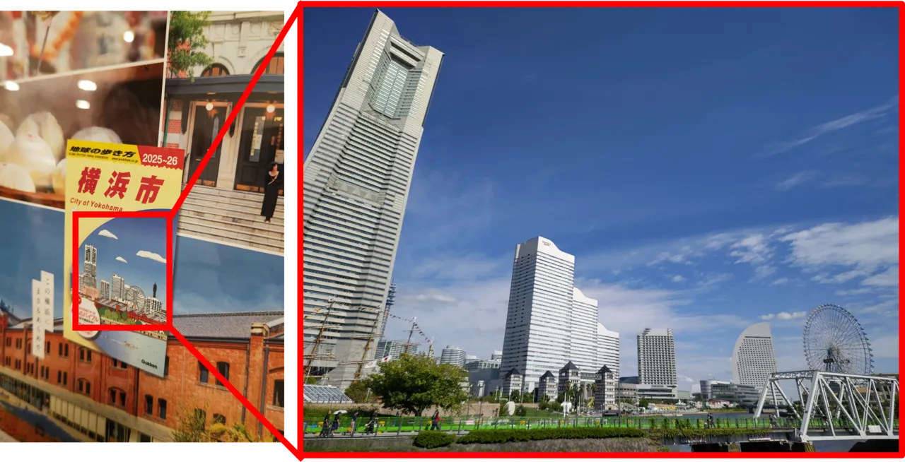 図1 横浜市役所に飾られたポスターと、同じ構図のみなとみらい。横浜市民に「横浜市を代表する風景」でアンケートをとった所、2,500件を超える回答の約70%がみなとみらいを投票したという