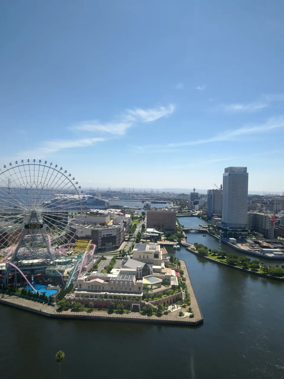 大観覧車コスモクロック21を右上に登場させました。しかしながら、見えている角度が異なる...。花火大会の時にあるフロアのR会議室から撮った写真を題材にしたので、観覧車の上部のみが見えるので、シンボル感がなくなってしまいました。