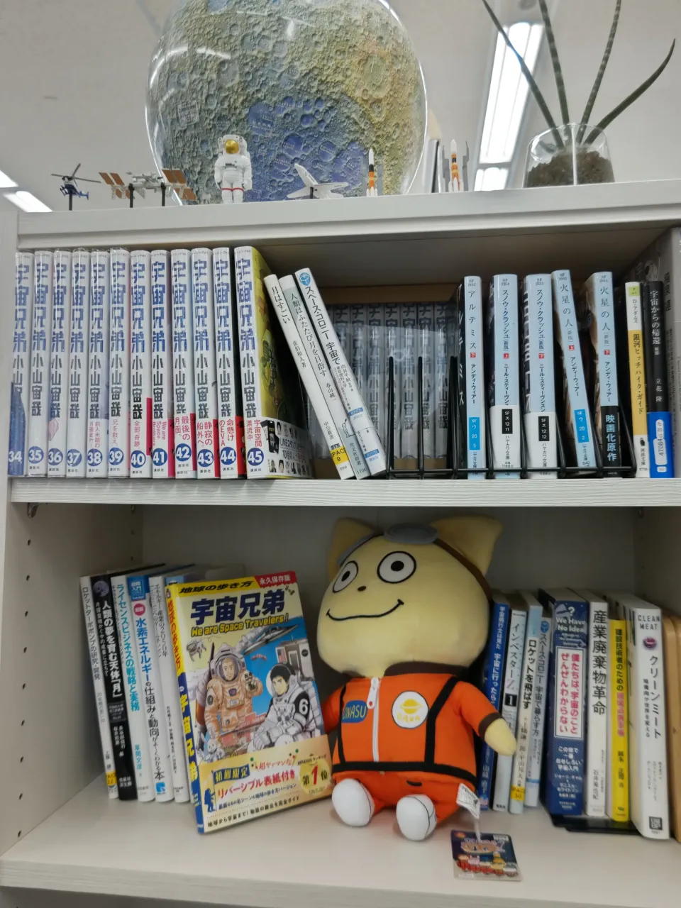 なお、ペーパーレスが浸透して紙の本や資料は減っていますが、宇宙エンジニア™専用の本棚には技術関連の図書に加え、私が大人買いして寄贈した『宇宙兄弟』の全巻、宇宙関連イベントでもらった『宇宙なんちゃら こてつくん』のぬいぐるみが飾られています。