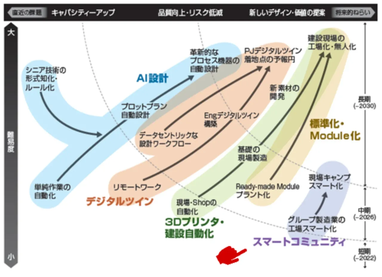 5つのイノベーション(AI設計、デジタルツイン、3Dプリンタ・建設自動化、標準化・モジュール化、スマートコミュニティ)により、受注した案件の確実な遂行と遂行キャパシティの拡大の実現を目指しています。