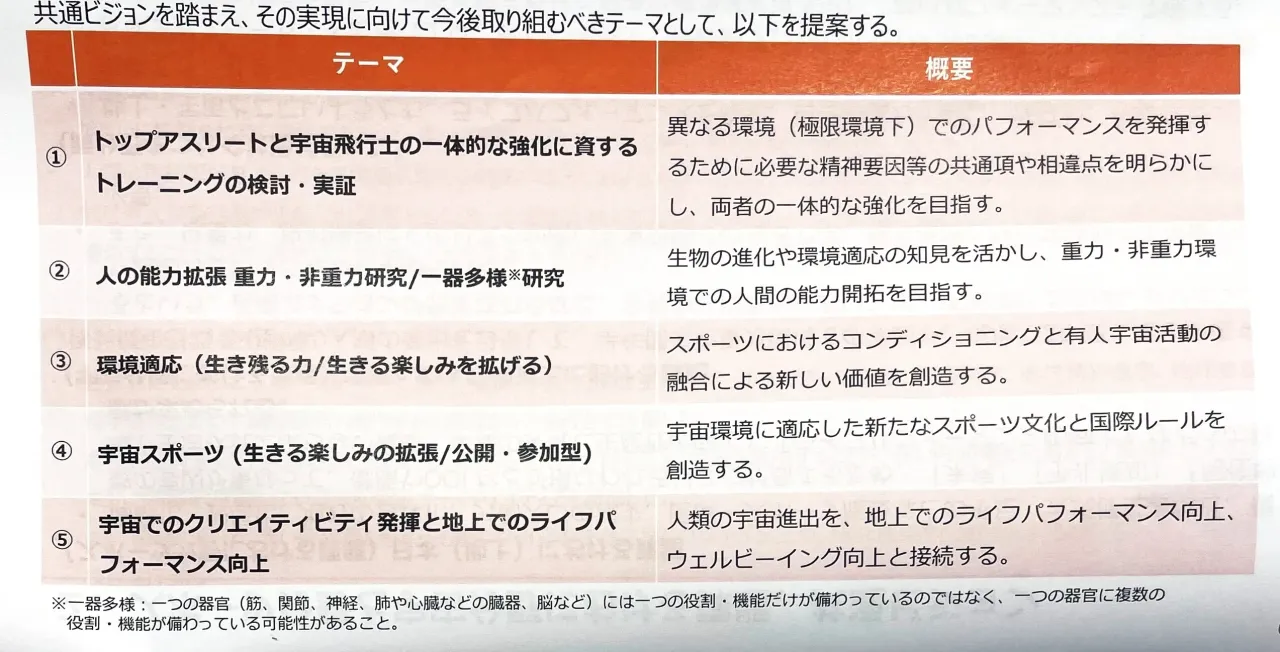 このビジョンを具体的な社会実装へと繋げるのが、検討委員会が策定した「5つの研究テーマ」である。アスリートのリカバリー技術を、宇宙飛行士の地球帰還後のリハビリへ転用する試みや、微小重力下での身体変化を高齢者のフレイル(虚弱)対策に活かすセンシング技術の開発など、そこには「ハイパフォーマンス(極限の勝利)」を「ライフパフォーマンス(市民の健康)」へと昇華させるための道筋が明快に描かれている。